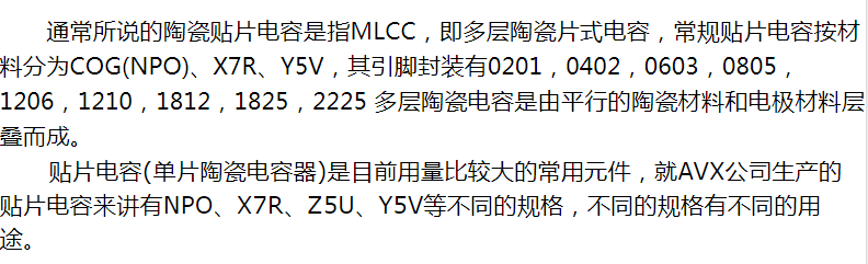 通常所說(shuō)的陶瓷貼片電容是指MLCC,即多層陶瓷片式電容,常規(guī)貼片電容按材料分為COG(NPO)、X7R、Y5V,其引腳封裝有0201,0402,0603,0805,1206,1210,1812,1825,2225 多層陶瓷電容是由平行的陶瓷材料和電極材料層疊而成。